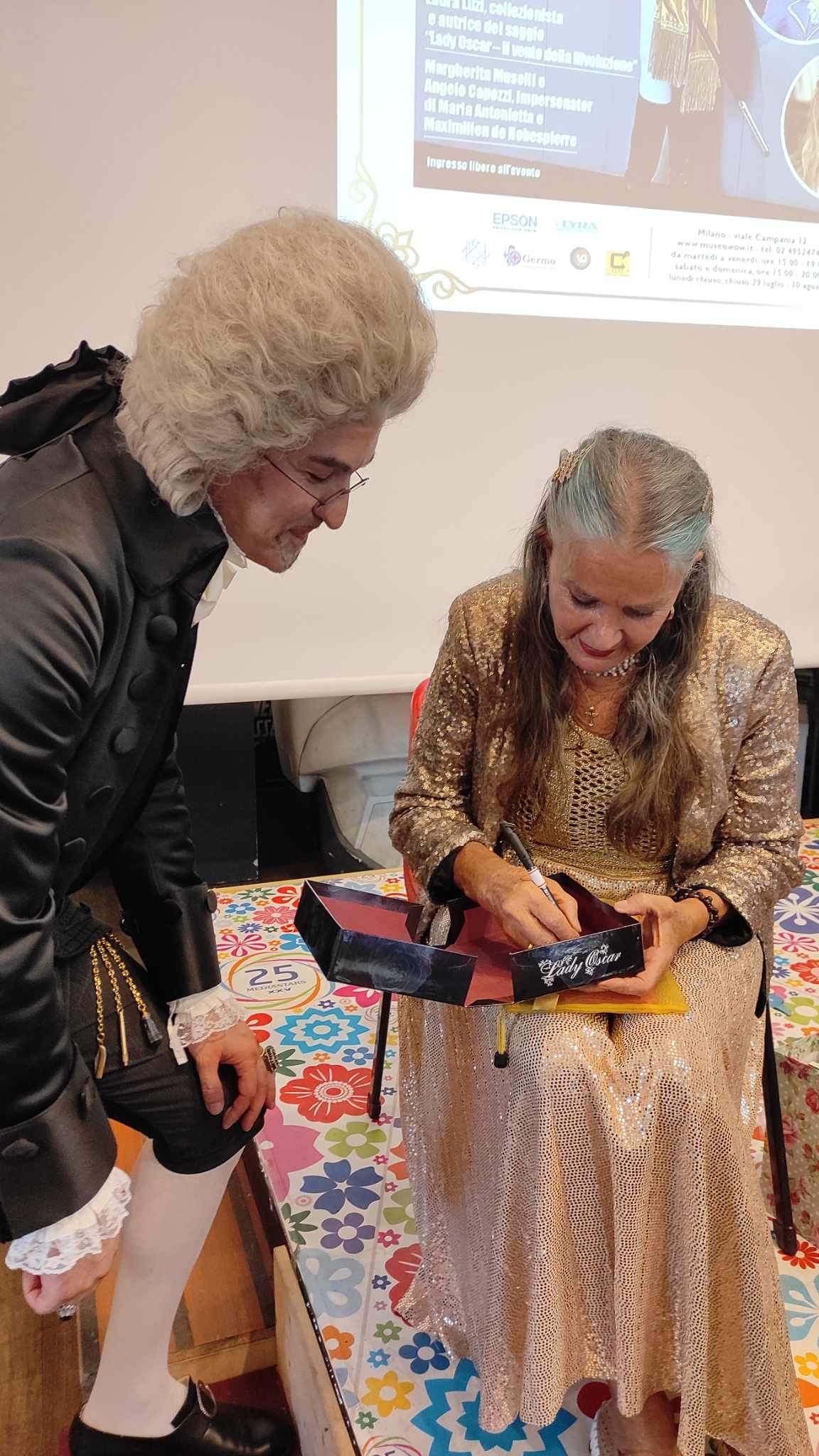Entre as atrações, foi realizada uma pequena apresentação, no com atores interpretando figuras históricas importantes da revolução Francesa, como, por exemplo: a rainha Maria Antonieta e o líder da Revolução Maximilien de Robespierre, personificados respectivamente pelos artistas Margherita Muselli e Angelo Capozzi. Enfim, visitando o site Lady Oscar 40 Anni da minha querida amiga, Elena Romanello, escritora e fã incondicional de Rosa de Versalhes, encontrei algumas imagens do evento especial de 14 de julho, deixo logo abaixo com os devidos créditos e agradecimentos aos autores: